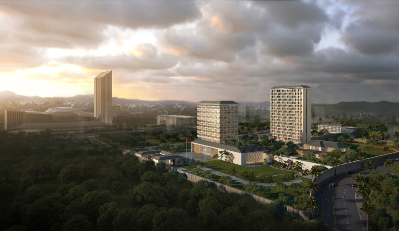 中国驻非盟使团新建馆舍工程建筑面积2.6万平方米,位于埃塞俄比亚首都亚的斯亚贝巴规划中的城市中央商务区,毗邻非盟总部,项目将与非盟会议中心共铸未来中央商务区的城市中心形象。建筑在充分考虑当地气候、城市、文化等因素的基础上,将中国文化与使馆的使用功能进行有机融合,着力构建多元、高效、宜人的特色使馆和文化传播的载体,同时体现了中非文化的汇聚共融。
