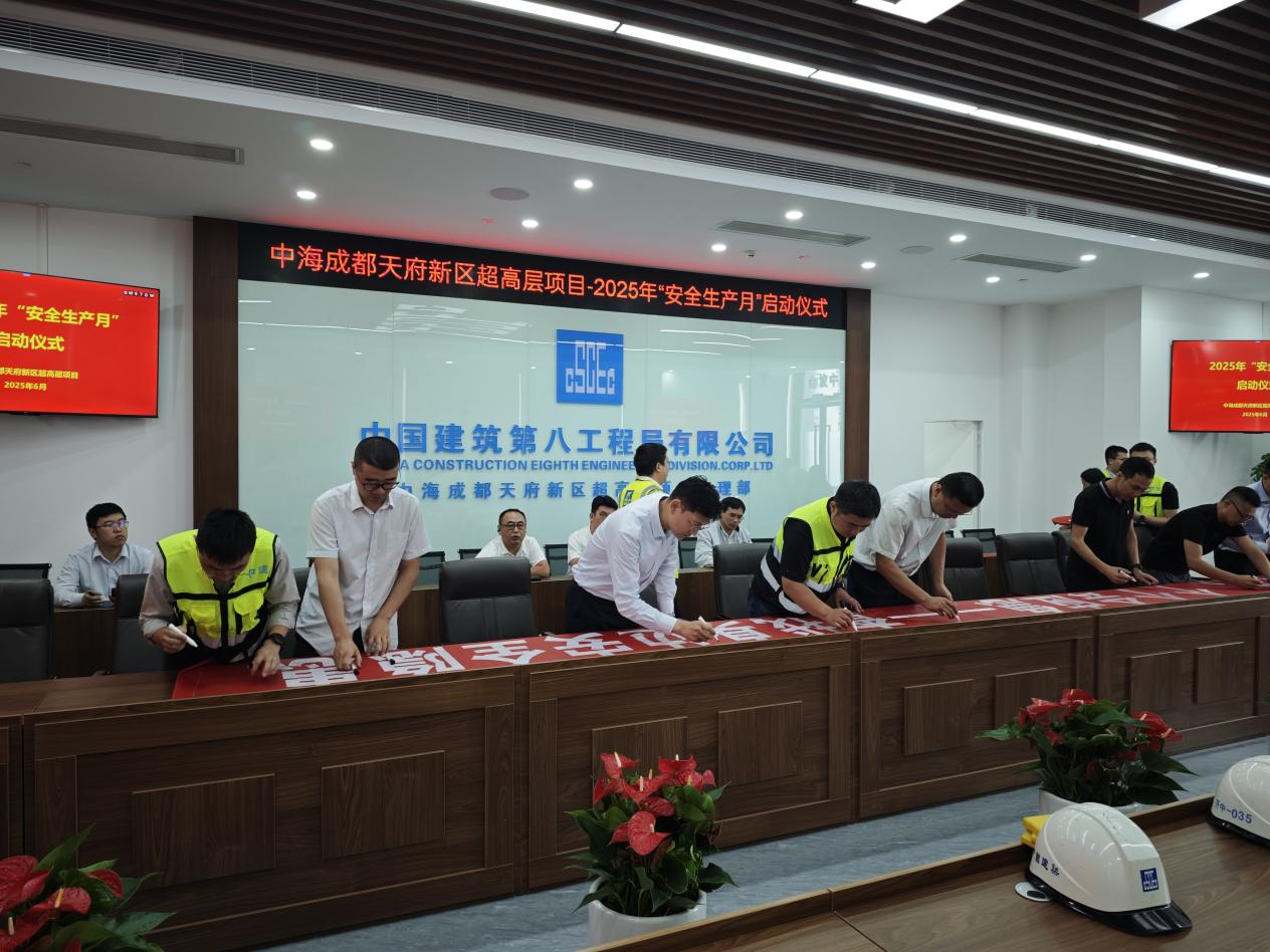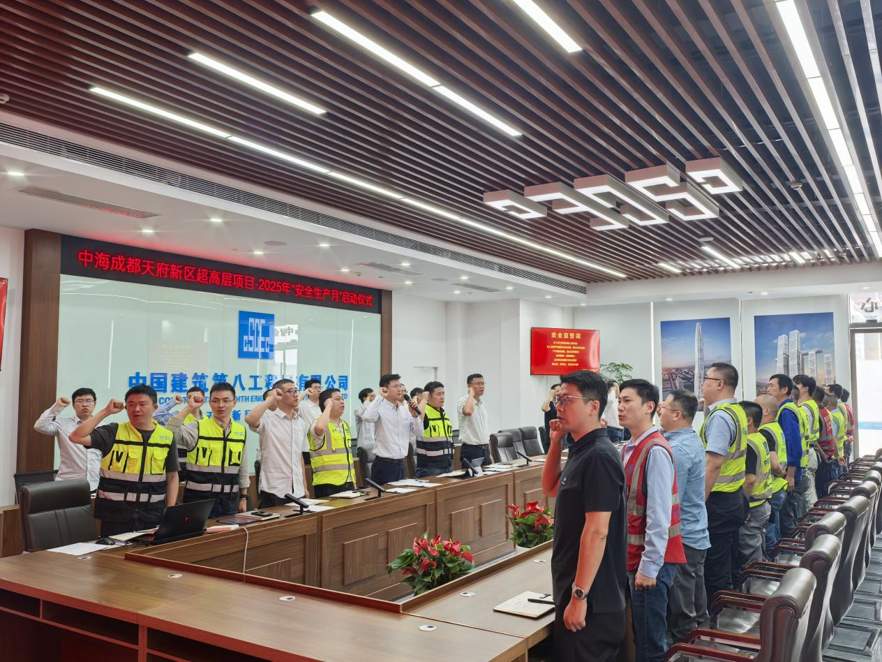 2025 年 6 月 5 日,中海成都天府超高层项目正式启动 2025 年 “安全生产月” 活动,以 “人人讲安全、个个会应急 —— 查找身边的安全隐患” 为主题,深入贯彻习近平总书记关于安全生产的重要指示,秉持 “人民至上、生命至上” 理念,通过 “宣传教育、系统培训、实践操作” 综合模式筑牢项目安全根基。