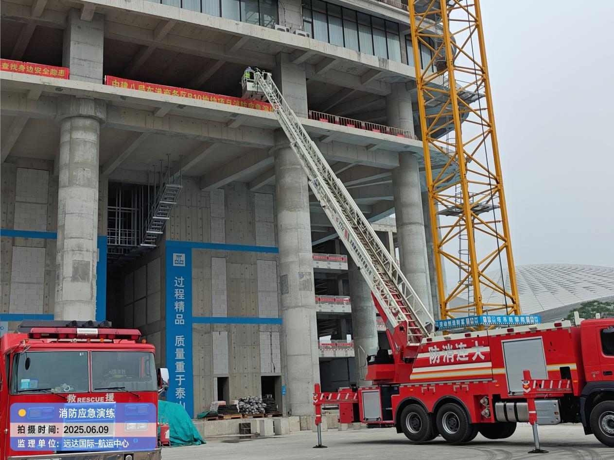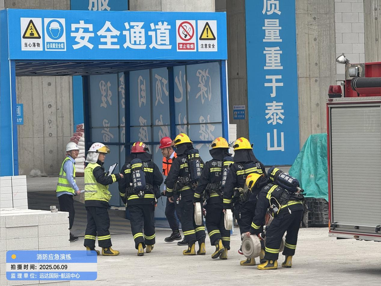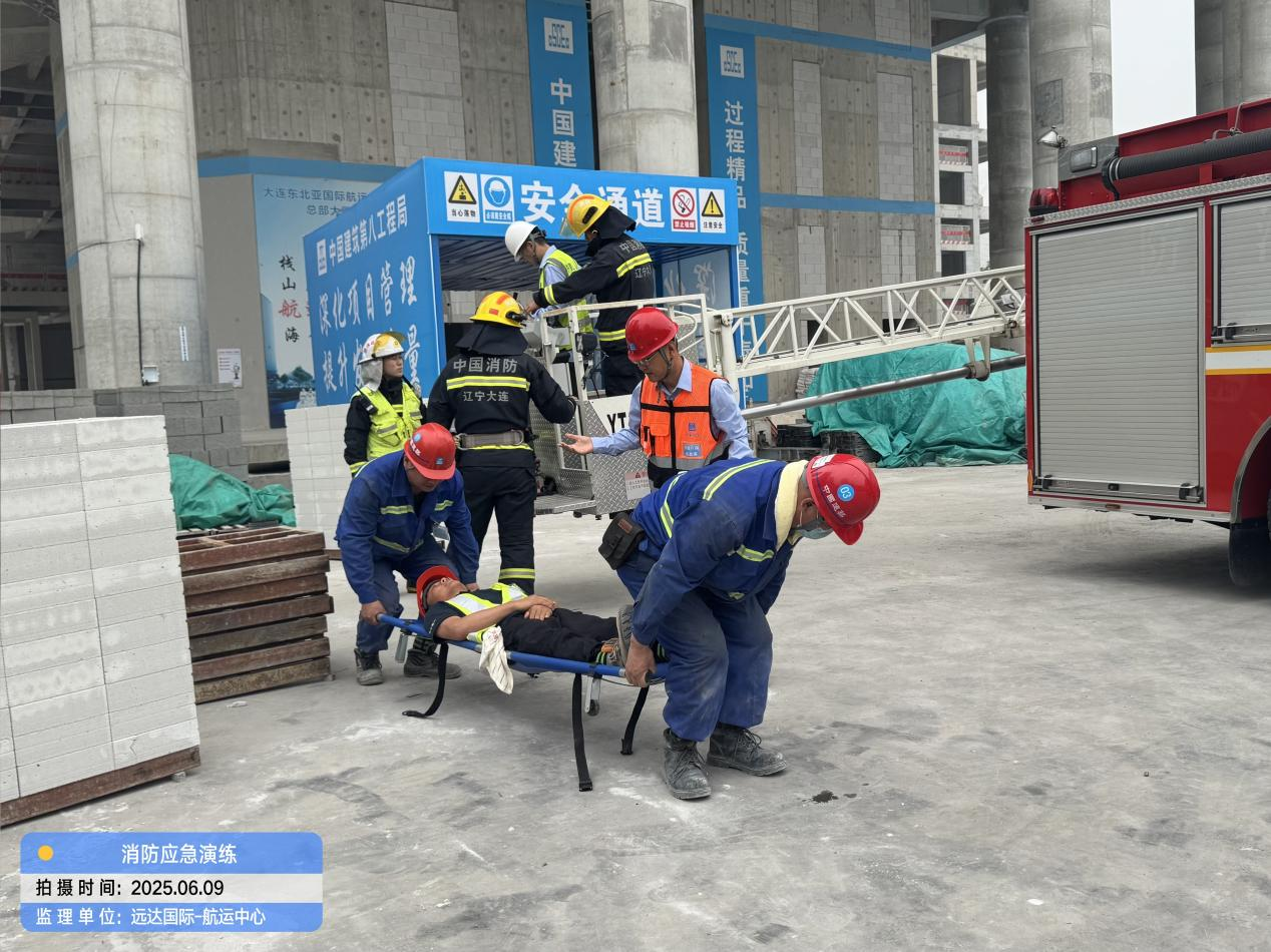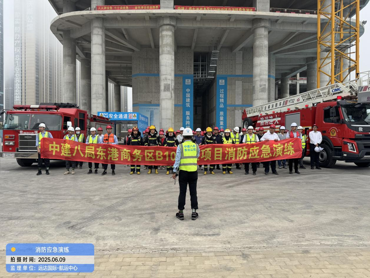 为积极响应2025年全国“安全生产月”“人人讲安全,个个会应急——查找身边安全隐患”活动主题,切实提升项目应对突发事件的实战能力和全员安全素养,6月9日,大连国际航运中心大厦项目施工现场举办了一场高标准、实战化的大型消防应急演练。本次演练由建设单位辽港集团、招商蛇口牵头组织,远达国际作为监理单位全程监督、协调并深度参与、联合总承包单位中建八局及各分包单位共同实施,并得到了大连市中山区住建局、大连市消防救援特勤一队以及属地街道办的专业指导与大力支持。