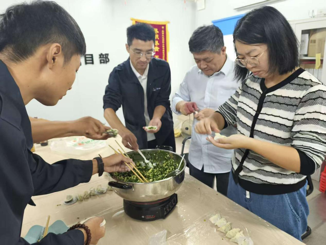 活动筹备伊始,现场便洋溢着热闹氛围。员工们自发围坐,揉面擀皮、调馅包饺、切果备菜,在默契协作中流淌着欢声笑语。一个个饱满圆润的饺子、一盘盘鲜亮诱人的瓜果,不仅是舌尖的盛宴,更凝结着同事情谊与“公司如家”的暖意。